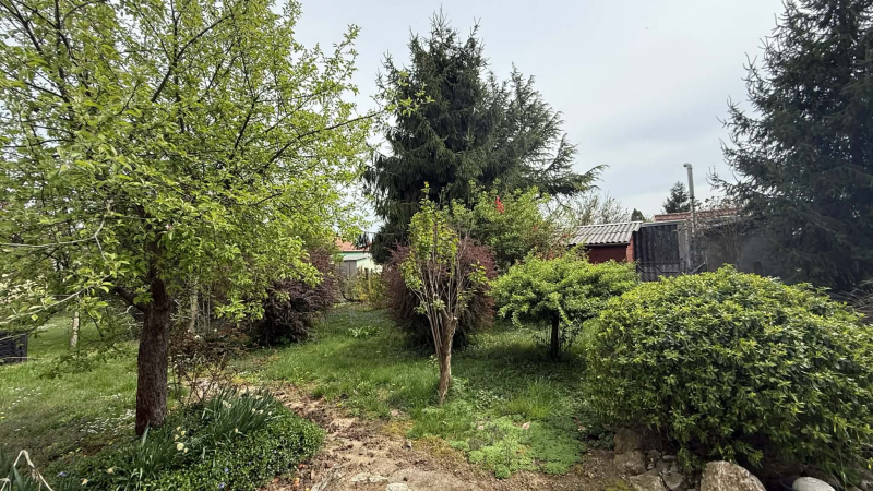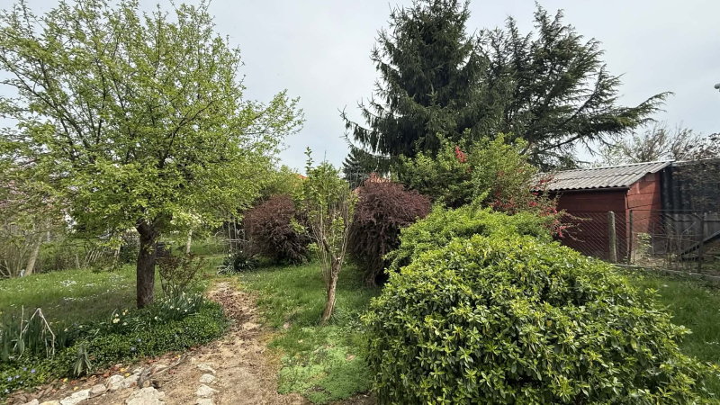 Der Garten ist gepflegt. Es gibt eine Garage, eine Werkstatt, einen Abstellraum und einen Keller